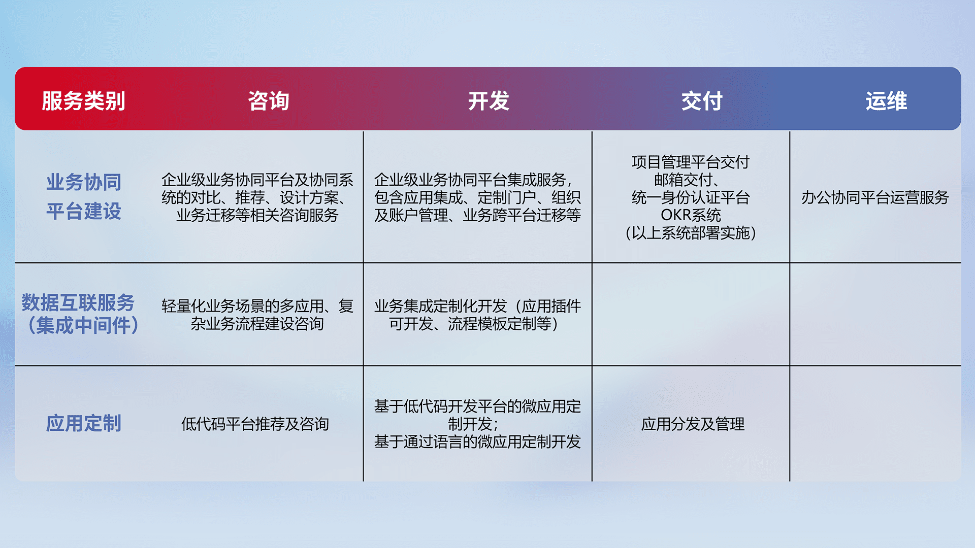 针对钉钉、、企微、、IDaas等平台级产品提供产品的规划、、方案、、交付、、、、定制化开发等服务,,,,实现如统一协同办公、、、智能客户服务、、混合会议管理、、、、智能数据查询、、、、等业务场景,,,,实现数字化转型。。。。